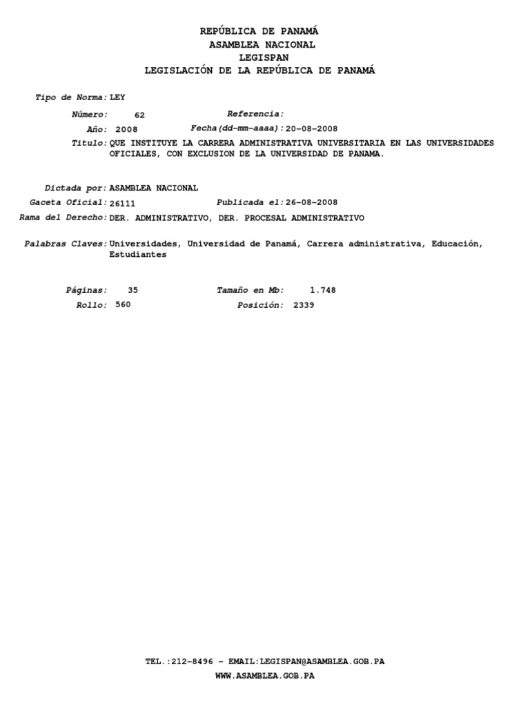 Victor levi sasso edificio academico no. La ley 62 de 20 de agosto de 2008 que instituye la carrera administrativa universitaria en las universidades oficiales con exclusion de la universidad de panama establece la realizacion de concursos internos interuniversitarios o externos con la finalidad de seleccionar al personal mas calificado e idoneo para cumplir a cabalidad con la funcion establecida para dicho cargo vacante. Reglamento de carrera de servidor publico administrativo de la universidad de panama 2016.