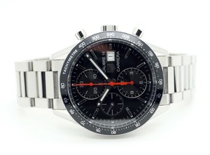 Tag heuer juan manuel fangio carrera cv2014ba0794 featuring a 41mm stainless steel case adjustable 7 bracelet and attractive black dial with red second hands and sub dial hands this special edition tag heuer carrera watch is distinctive and stylish.