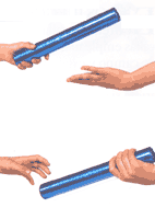 Entrega y recepcion del testimonio. Al portarlo de esta manera minimizara la posibilidad de caida al momento de pasarlo a su companero. 1 4 x 100 donde cada corredor corre 100 mts.