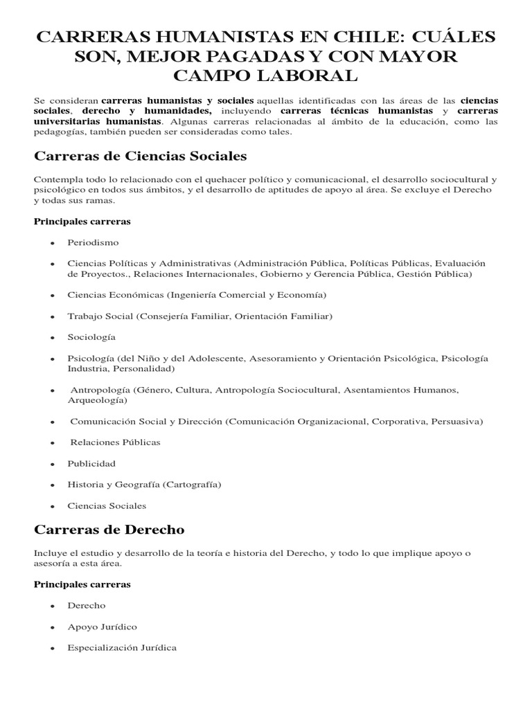 Los estudios en periodismo psicologia filosofia o pedagogia resultan de gran ayuda a la hora de disenar y manejar los nuevos dispositivos digitales. Cuales son mejor pagadas y con mayor campo laboral si tienes vocacion por las letras seguramente te interese saber algo mas sobre las carreras humanistas en chile. El sueldo promedio de las carreras administrativas y de negocios es de 13 mil 750 pesos.