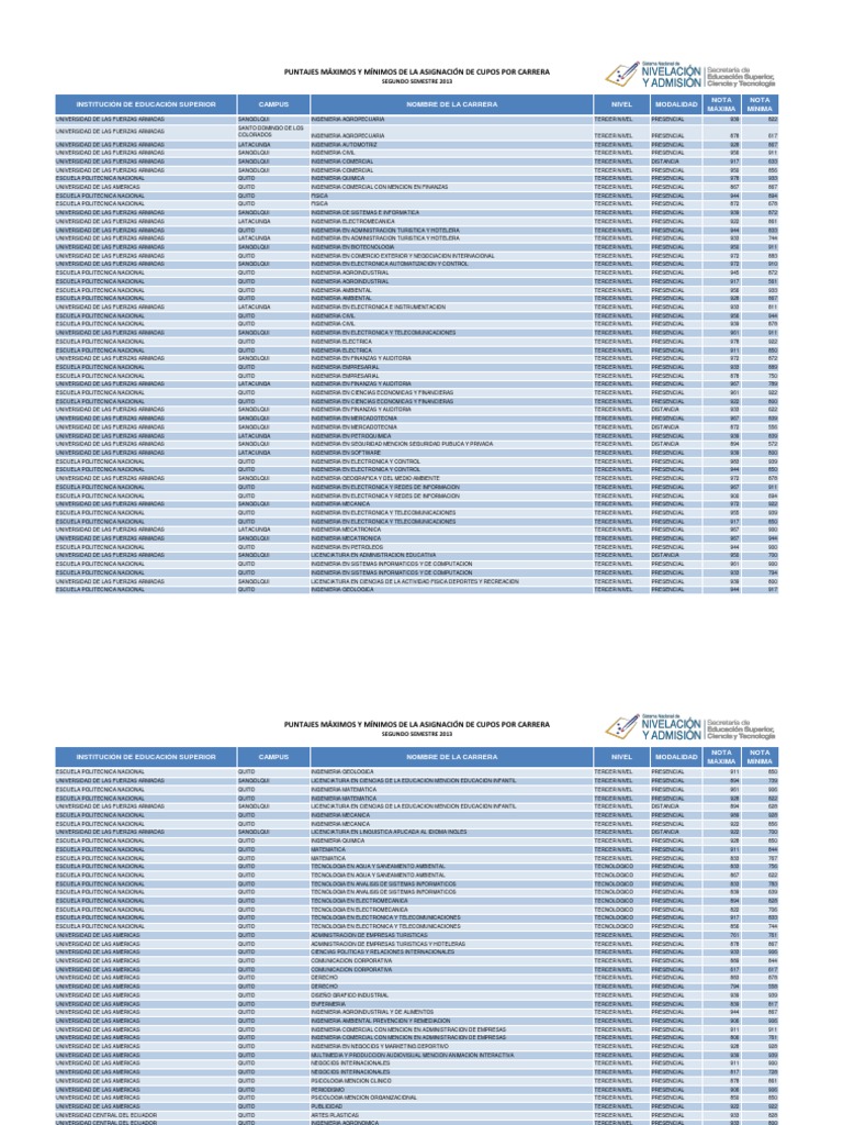 Es decir deben ser considerados. Puntajes maximo y minimos 2020 carreras universitarias snna navegador no compatible los puntajes publicados corresponden a otro periodo del snna por lo que deben ser tomados solo como una referencia no se utilizaran los mismos para el actual periodo pero seran bastante parecidos. Puntajes maximos minimos referenciales eaes referencia ser bachiller admisiones postulaciones senescyt en el presente documento digital se encuentran los puntajes historicos con los que las y los postulantes han accedido a las carreras en periodos anteriores.