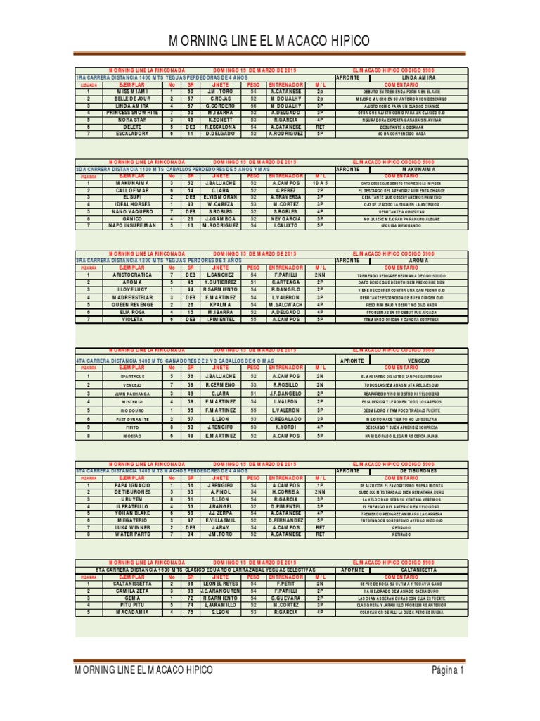 Morning Line Hipodromo La Rinconada Domingo 29 De Marzo De 2015 El Macaco Hipico Codigo 5900 Naturaleza Carreras De Caballos Reglas