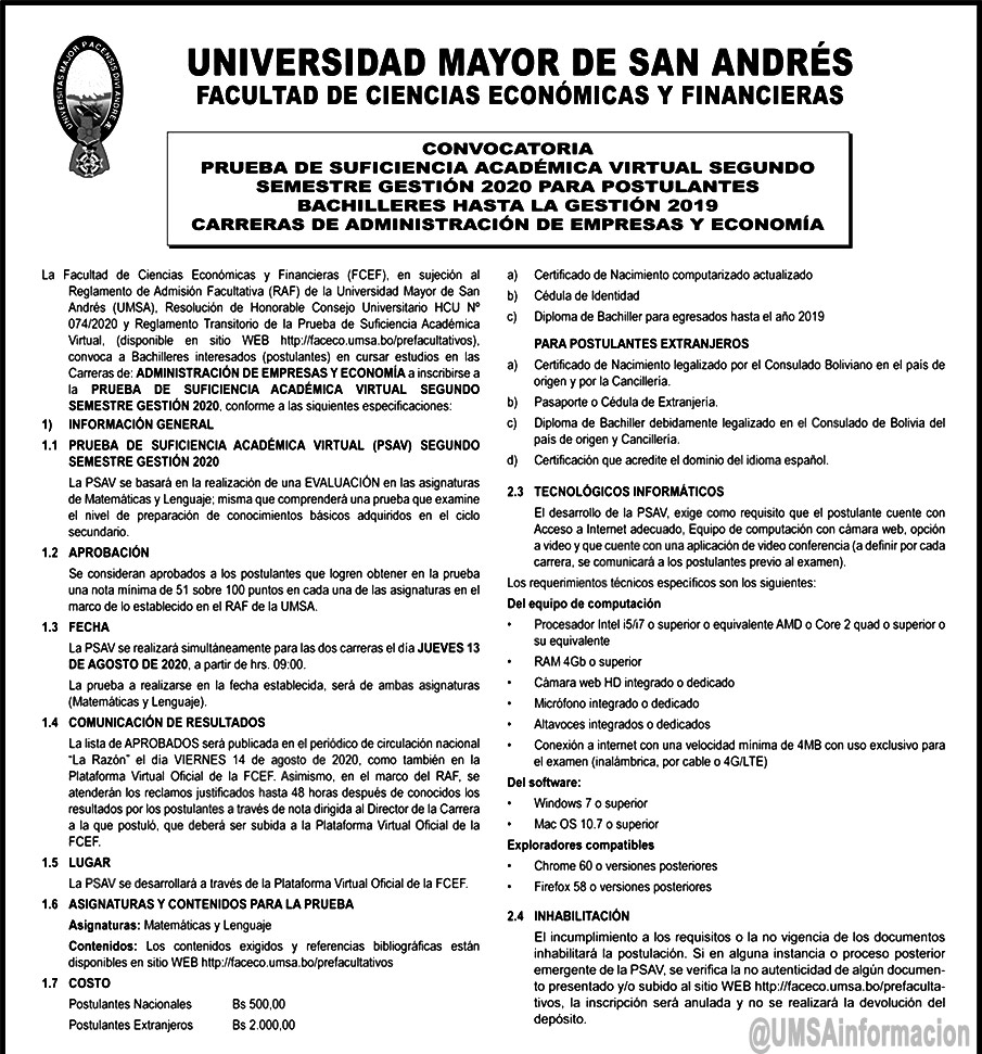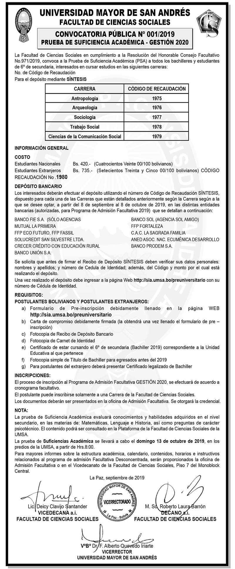 La universidad mayor de san andres tambien conocida usualmente por la sigla umsa es la principal universidad publica del estado plurinacional de bolivia establecida desde 1830 en el departamento de la paz sede de gobierno y desplegada a lo largo del mismo en la ciudad capital y sus provincias en 4 centros regionales universitarios crus y diversas sedes universitarias locales suls. Corrientes 1723 c1042aad caba sede artes. Prueba de suficiencia academica.