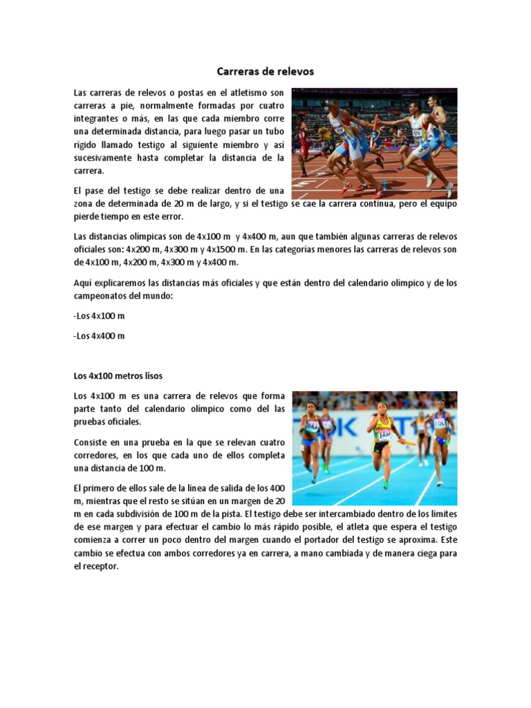 En la carrera de relevos de atenas se encendia la antorcha en el altar de eros erigido en la academia de platon y se portaba sobre una distancia de 1600 maproximadamente a la necropolis. Los 4x100 m es una carrera de relevos que forma parte tanto del calendario olimpico como del las pruebas oficiales. En una carrera de relevo los participantes le entregan una posta a su companero el cual este debe seguir corriendo y llevarla hasta el final.